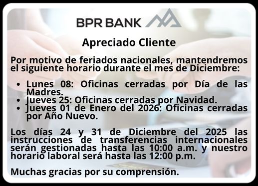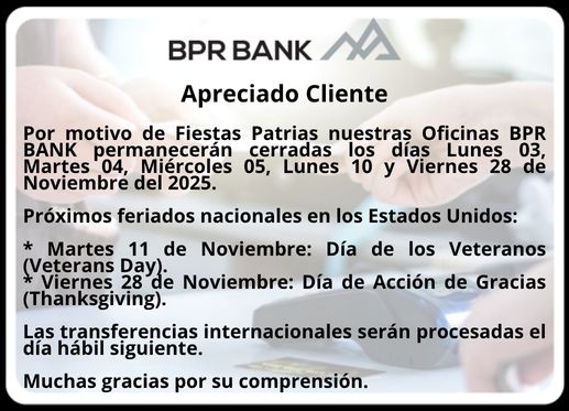 - Envíe pagos y bonificaciones a cuentas en BPR Bank; sin costos de transferencias.